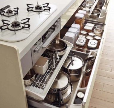 収納力がバツグンなキッチンにしませんか? 物がスッキリ片づく、充実した収納のシステムキッチンにリフォームして、綺麗で見せられる台所空間に!
