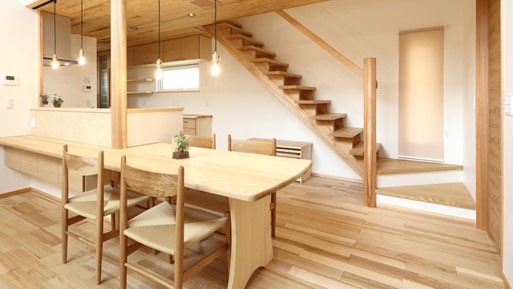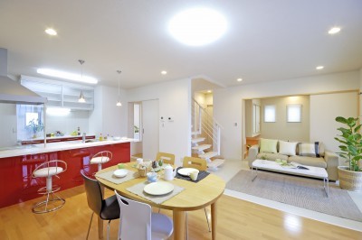 居間とダイニングをひとつなぎに、独立キッチンを配置して開放的なLDK空間!気持ちも明るくなります