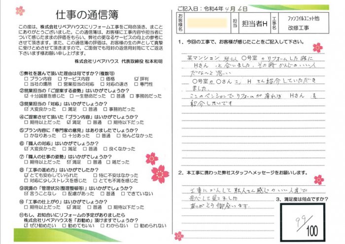 某マンションの○号室のリフォームの時にHさんと会いました。その時感じのいい人だな~と思い、○号室の〇さんににHさんを紹介していただきました。