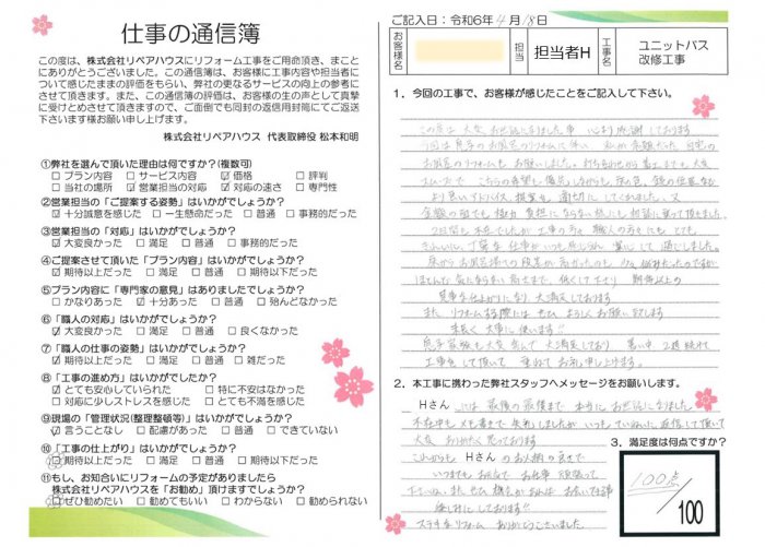 今回は息子のお風呂リフォームに伴い、私が念願だった自宅のお風呂リフォームもお願いしました。打合せから着工までも大変スムーズで、こちらの希望も優先しながらも