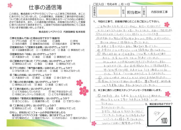 ⑤職人の手配や作業内容もこちらの思いを優先させていただきましたし、大変スムーズなリホーム計画でございました。他社の方は、2ヶ月程度かかるところもございましたために本当にありがたかったです。私が直接職人の方に、ご挨拶できずに申し訳なく思っています。出来栄えはとても満足のいくものでした。主人も「いいね!かなり!」と言っておりました。