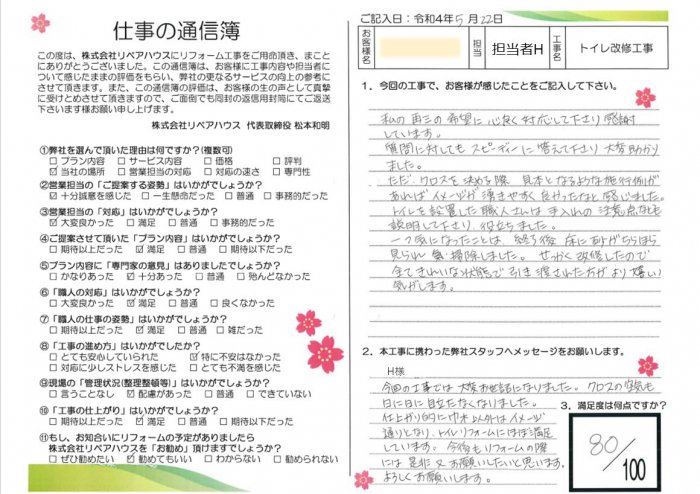 トイレを設置した職人さんは手入れの注意点なども説明して下さり、役立ちました。
