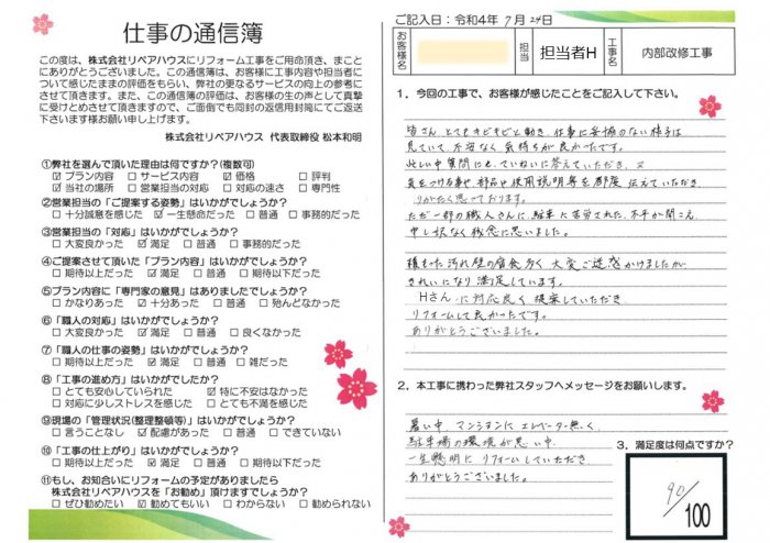きれいになり満足しています。Hさんに対応良く、提案していただき、