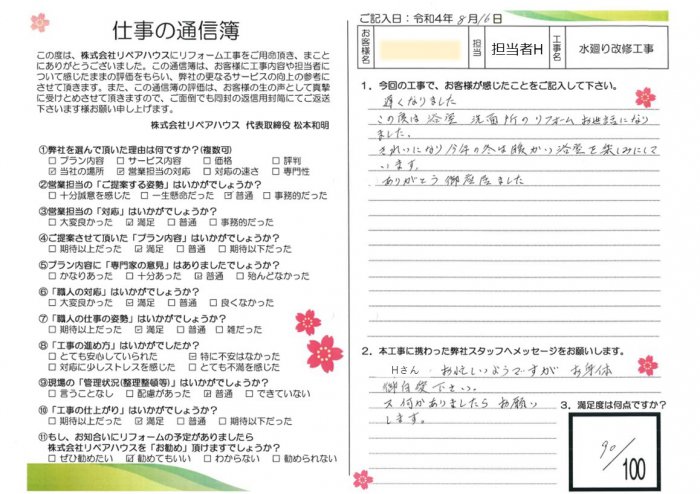 この度は、浴室、洗面所のリフォームお世話になりました。